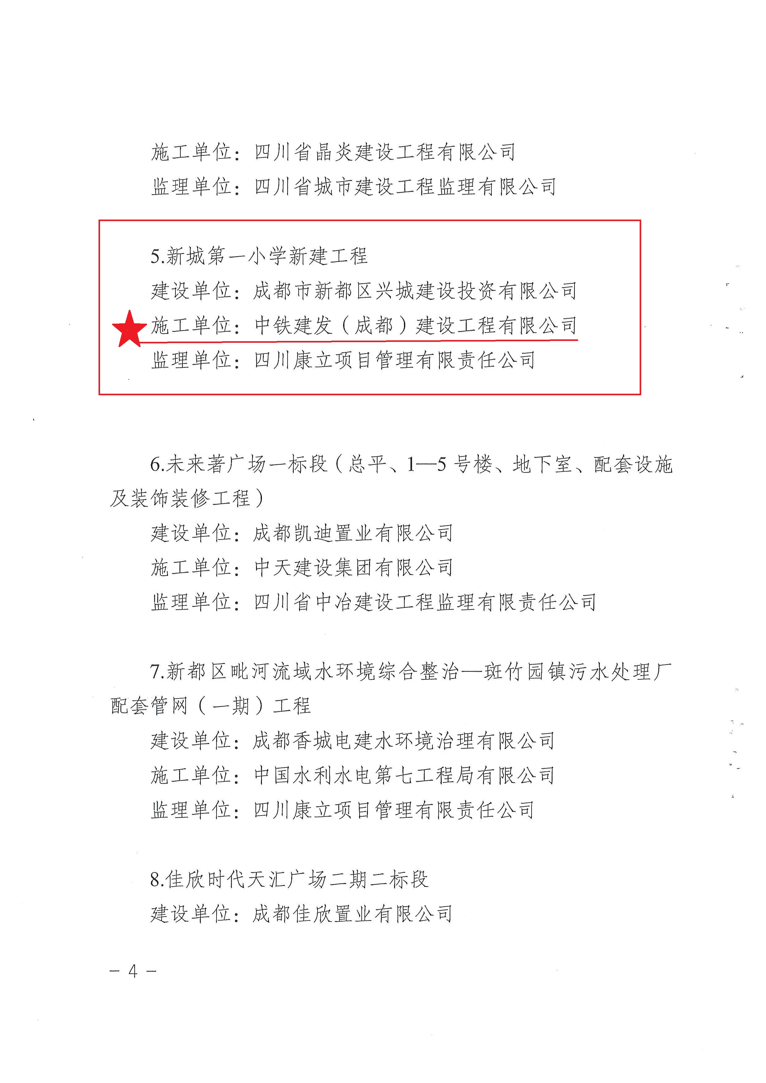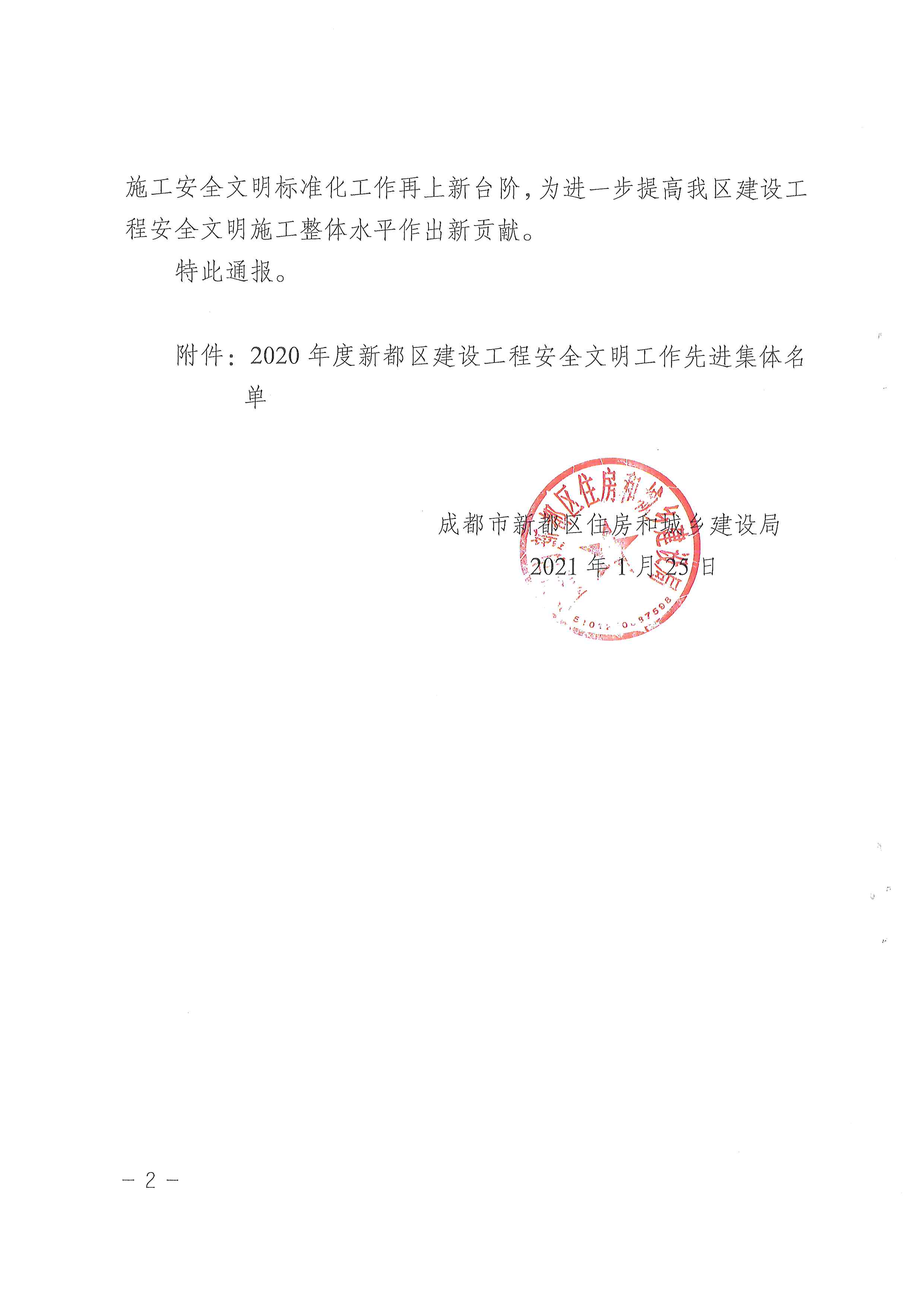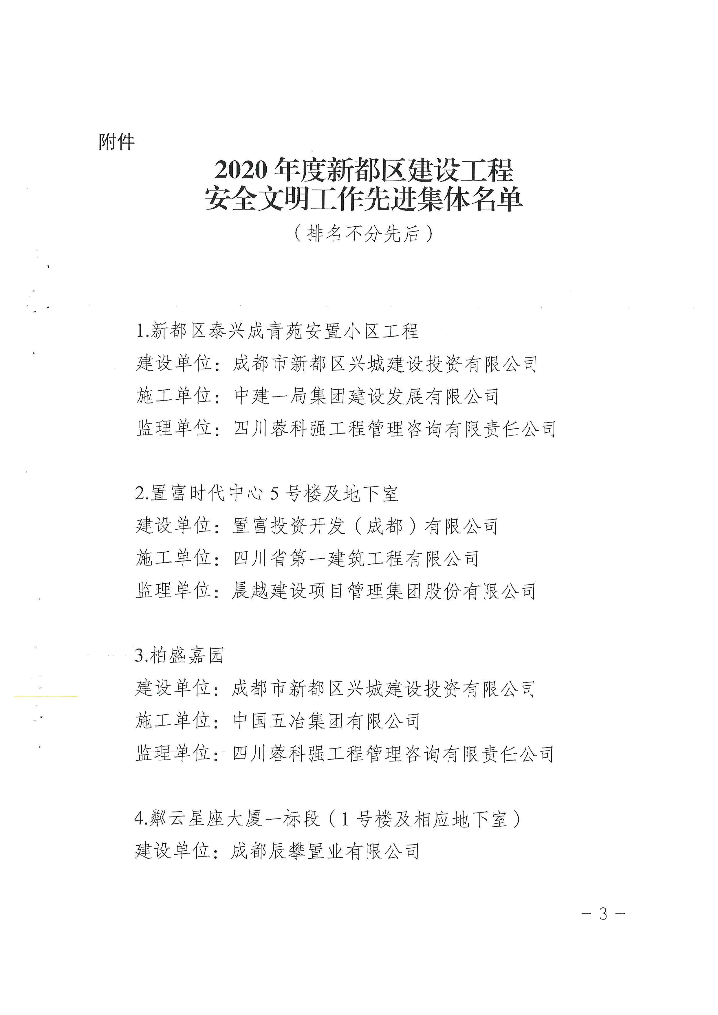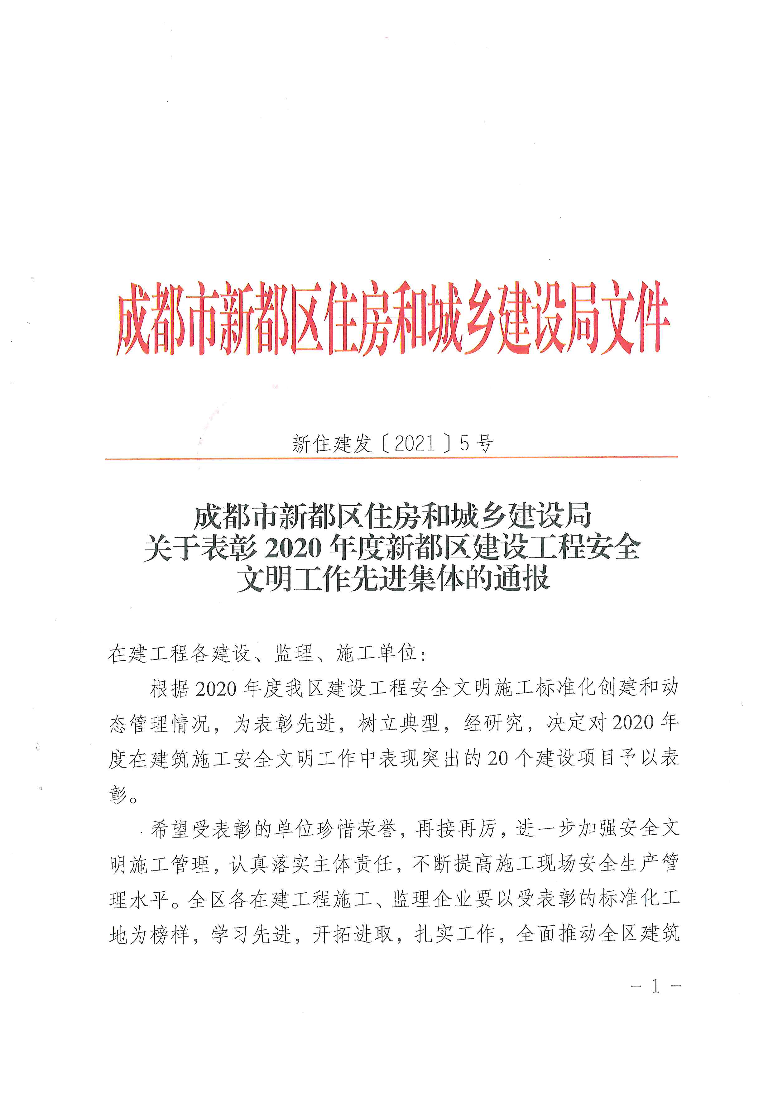 件,表彰2020年度新都区建设工程安全文明工作先进集体,中铁建发(成都)建设